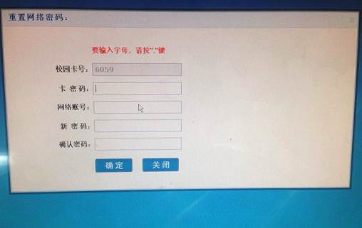 选择“网络交费”选项将进入用户账号充值界面,选择“重置网络密码”和“重置邮箱密码”选项将进入用户账号和电子邮箱密码重置界面,选择“返回”选项将返回上一级菜单。