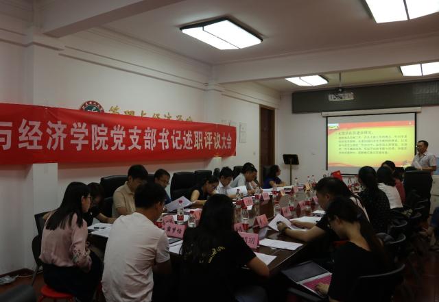 为全面贯彻落实党的十九大、十九届二中全会、三中全会精神、以推进“两学一做”学习教育常态化、制度化,不断加强领导班子建设和党支部规范化建设,不断提升党支部的凝聚力和战斗力,管理与经济学院党委常态化开展党支部书记抓党建述职评议,继 2017年实现党支部书记述职全覆盖以来,2018年7月2日在主楼317会议室再次召开新一轮党支部书记抓党建工作现场述职。学院党委委员、党政联席会成员出席会议,教师党支部书记、学生党支部书记参加会议,副书记、副院长彭明雪主持会议。学校党委组织部徐碧瑢,党建和思想政治工作专家巫后新出席会议。